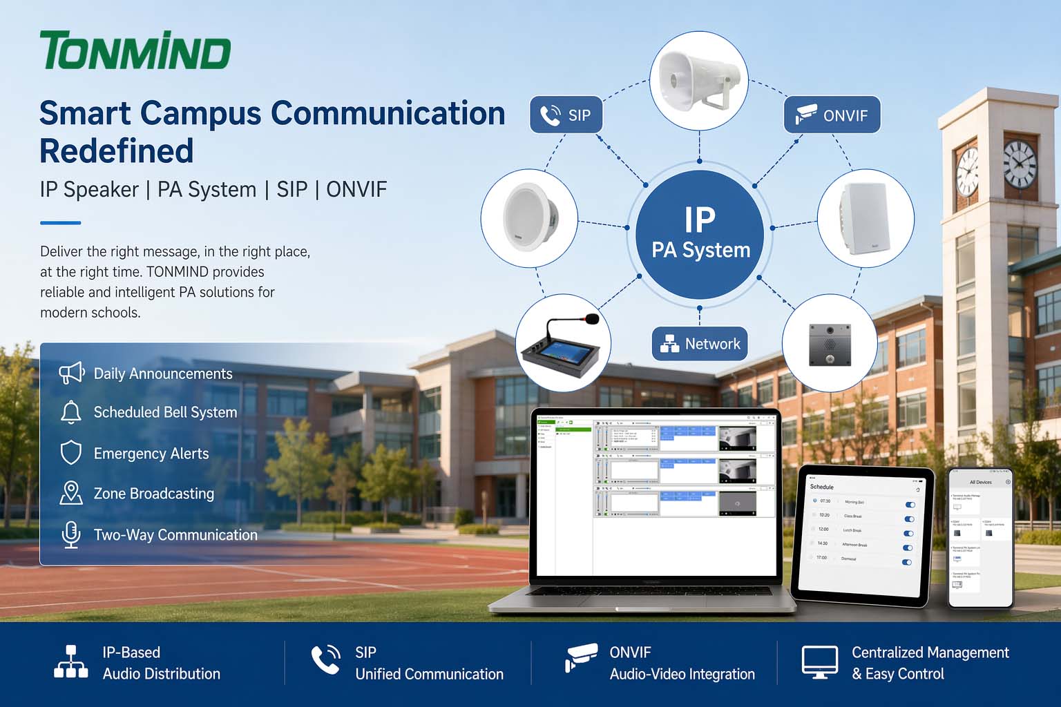 By combining IP Speaker, SIP, ONVIF, and intelligent PA System management, TONMIND creates a unified communication platform that goes beyond simple audio broadcasting. It bridges the gap between security and communication, enabling schools to respond faster, operate more efficiently, and maintain a safer environment for students and staff.