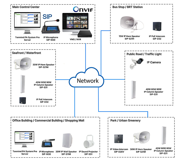 The TONMIND Public Area Solution blends modern network-based PA system capabilities with industry-standard protocols like SIP and ONVIF. By using IP Speakers and open integrations, cities and public venues can communicate more effectively, enhance safety, and deliver a richer visitor experience. This solution is not just audio hardware — it’s a cornerstone of connected, responsive urban environments.