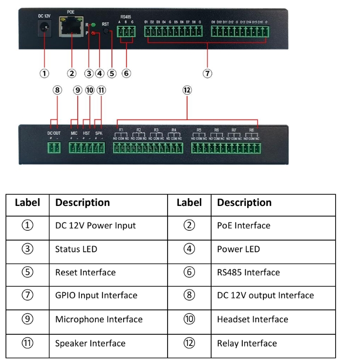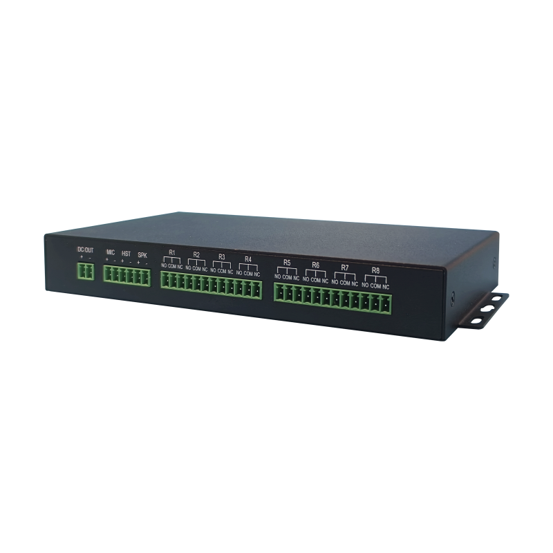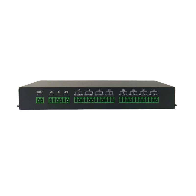1 × Mikrofon-Eingang, 1 × Headset-Ausgang, 1 × Lautsprecher-Ausgang, 8 × Relais, 16 × GPIO-Alarm-Eingänge, 1 × DC-Ausgang, 1 × RS485, 1 × Reset |